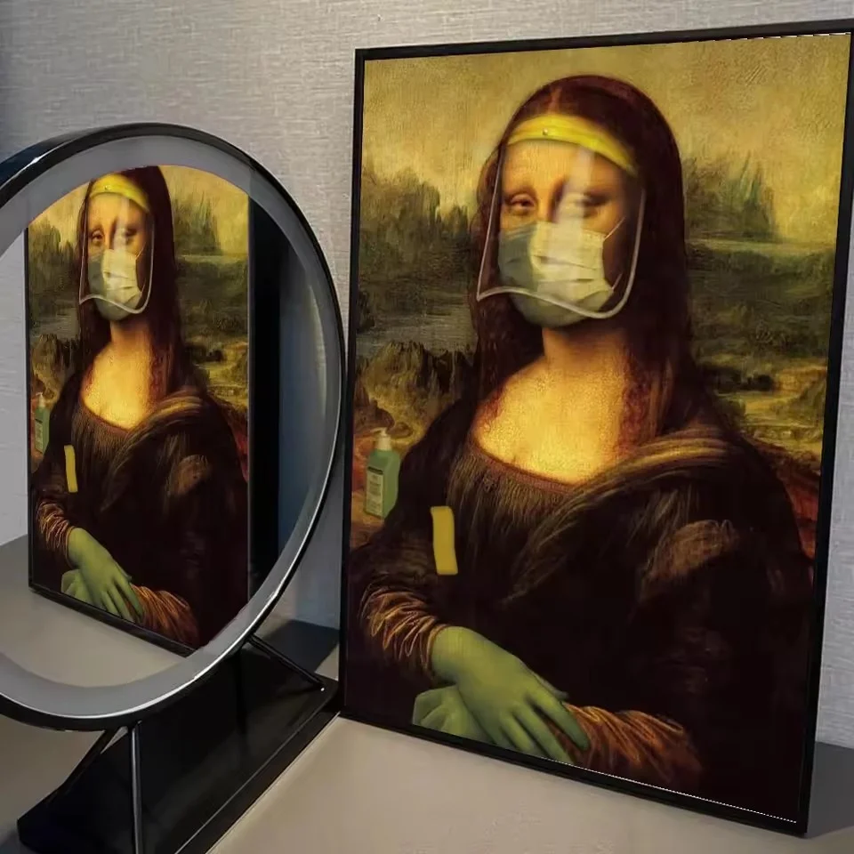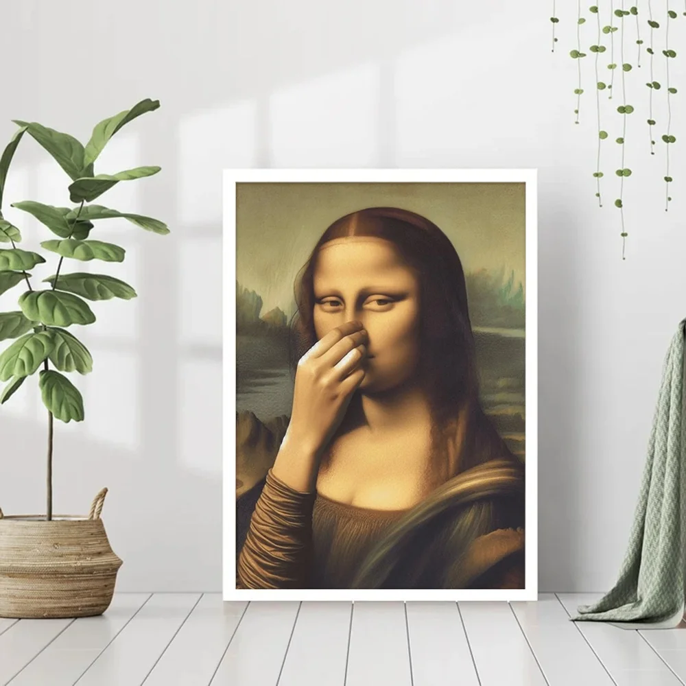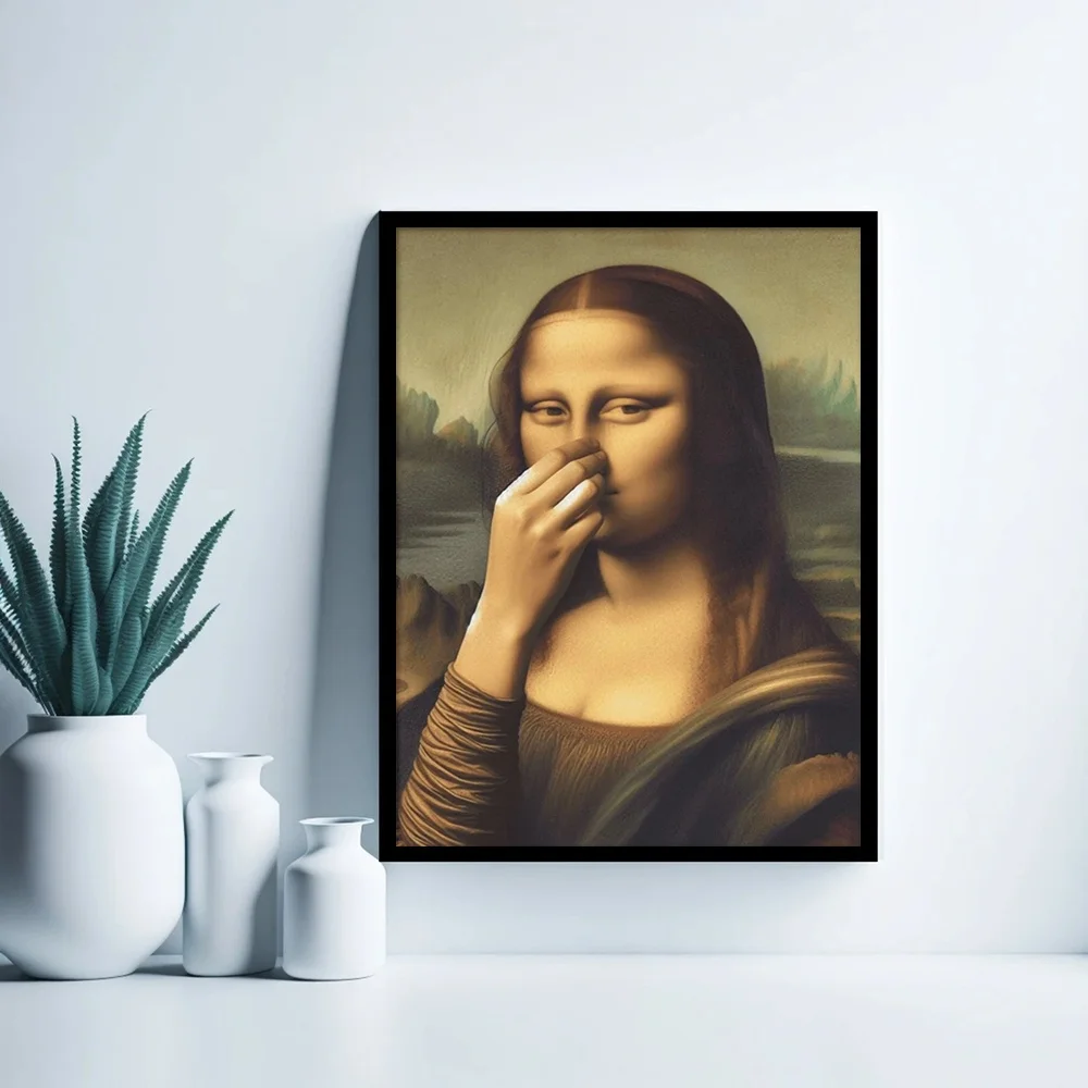 Add a touch of humor to your bathroom decor with this charming vintage print featuring the iconic Mona Lisa covering her nose. Perfect for toilet areas or any space that needs a lighthearted decoration!